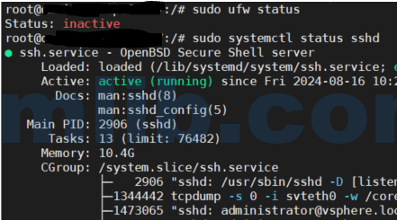 You should see that the firewall is disabled and the SSH daemon (sshd) is active.