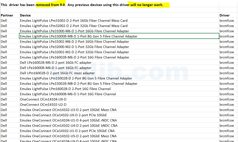 两份列表均来源博通官方,第一份为停止支持的列表清单,第二份为支持受限的设备清单,请各位自行下载和搜寻各自服务器里的设备硬件是否在这两份列表里。