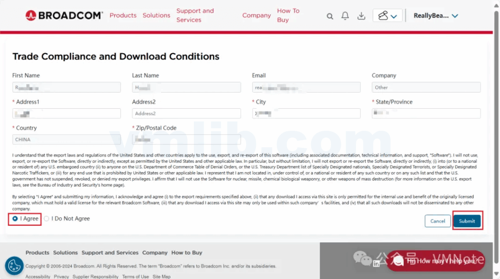 第12步,在Trade Compliance and Download Conditions页面,根据要求填写个人信息,然后点击Submit