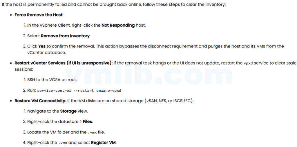 在日常维护 VMware vCenter Server 与 VMware ESXi 集群时,如果某台 ESXi 因为硬件故障、断电、管理网中断或整机宕机,vCenter 往往会把该主机标记为 Not Responding。这时问题就不只是“主机离线”这么简单,随之而来的一系列管理异常更让人头疼:虚拟机显示 Inaccessible 或 Orphaned、无法开关机、无法迁移,Host 的 Disconnect 按钮变灰,Remove from Inventory 也点不了,甚至通过 iLO/iDRAC/带外管理都无法恢复控制。