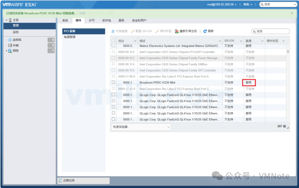 (4)检查ESXi识别的PCIE硬件,发现H330的直通状态为 活动(Active)