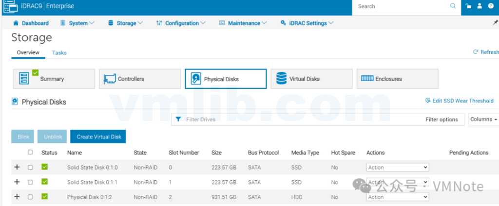 基本信息:一台 Dell PowerEdge R640 服务器,配有一张 PERC H330 阵列卡。连接了两块 240GB 的 SSD 和一块 1TB 的 HDD。这三块硬盘在阵列卡上都设置为 Non-RAID 模式(即不组成RAID阵列)。在 ESXi 系统中,客户分别用这三块硬盘创建了三个独立的数据存储空间(Datastore),其中ESXi系统安装在1TB的HDD中。