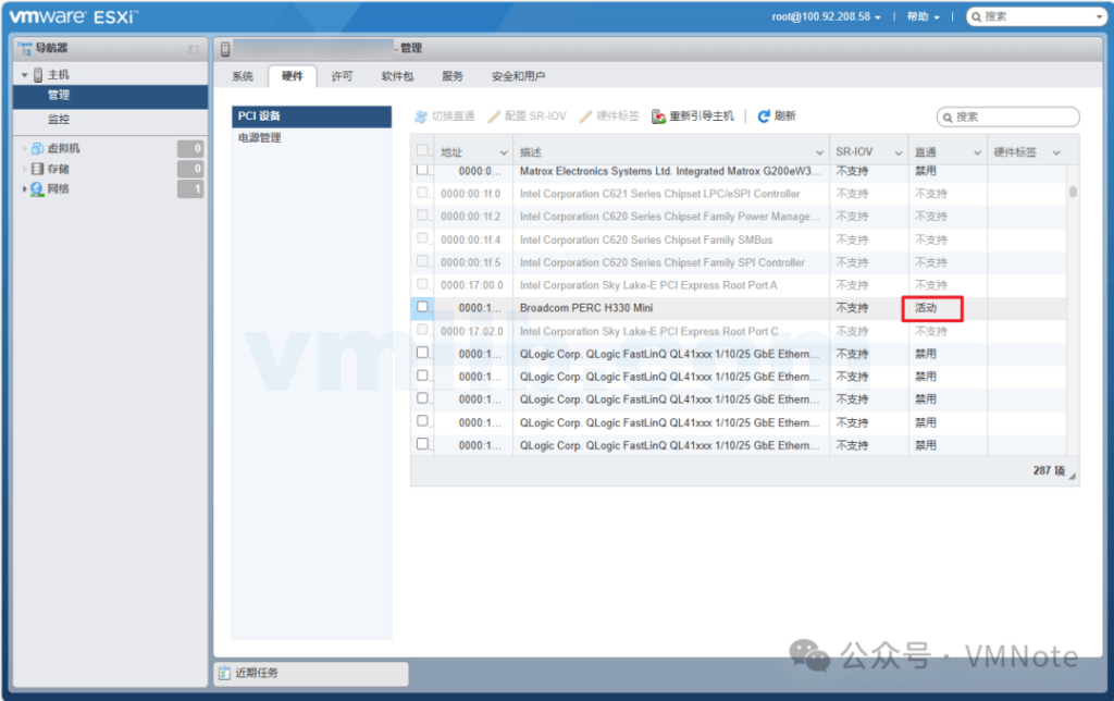 (4)检查ESXi识别的PCIE硬件,发现H330的直通状态为 活动(Active)