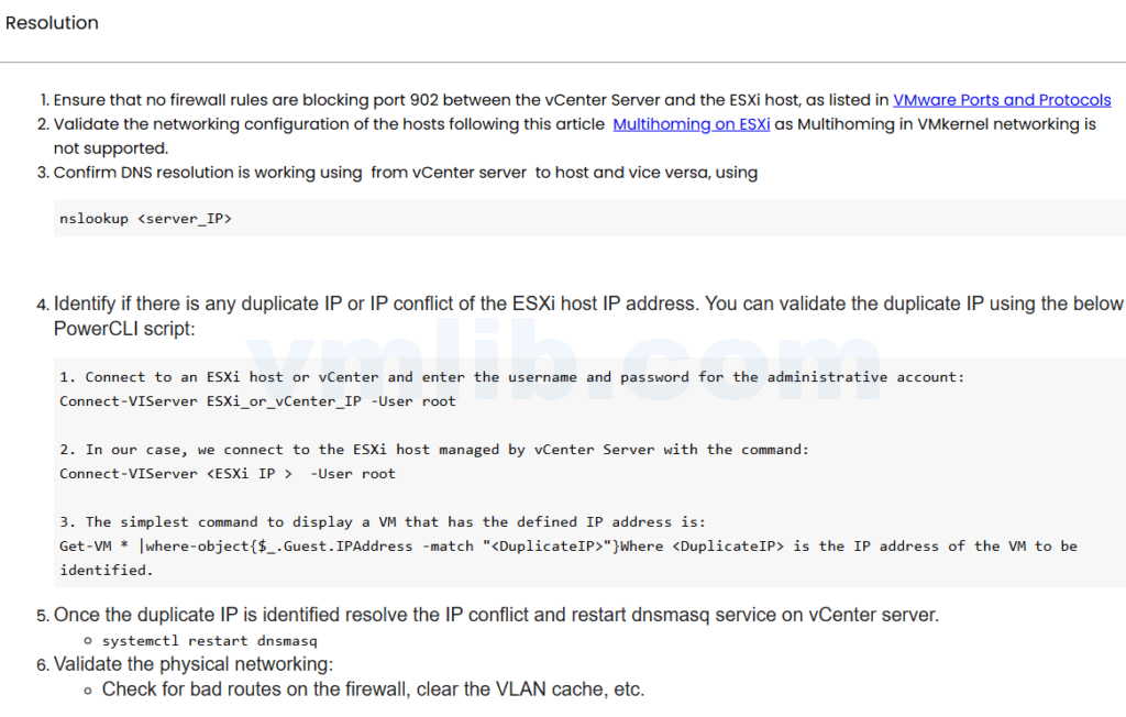 vCenter Server 与 ESXi 主机之间的通信主要依赖于 902 端口(VMware Server 服务)。如果这个端口被防火墙阻塞,就会导致连接超时。