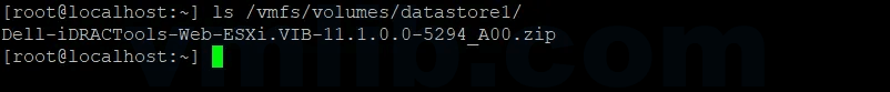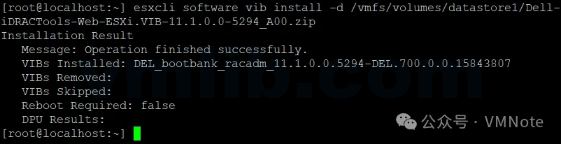 [root@localhost:~] esxcli software vib install -d /vmfs/volumes/datastore1/Dell-iDRACTools-Web-ESXi.VIB-11.1.0.0-5294_A00.zip