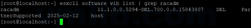 [root@localhost:~] esxcli software vib list | grep racadmracadm 11.1.0.0.5294-DEL.700.0.0.15843807 DEL PartnerSupported 2025-02-12 host
