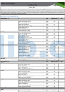 本文档包含了VMware产品的出口合规性信息,包括ECCN和HTS编号以及相关许可和分类信息。VMware产品受美国出口管制法规的限制,需要出口者符合相关法规并提供分类信息。该文档列出了不同产品的相关分类和许可信息。
