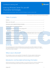 本文件概述了在虚拟化技术(如VMware ESX/ESXi、Microsoft System Center Virtual Machine Manager、Virtuozzo和Azure HUB)中使用Windows Server的许可要求,适用于所有Microsoft商业许可项目。内容包括许可证更新、基础知识、集群和迁移实例的许可以及Microsoft容器的介绍等。