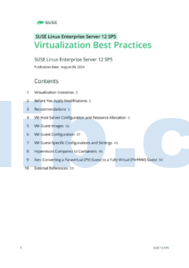 本指南旨在提供SUSE Linux Enterprise Server 12 SP5虚拟化最佳实践,包括虚拟化场景、修改前的注意事项、推荐配置、VM主机服务器配置及资源分配、VM客户机映像以及特定的设置等,旨在提高VM客户机性能并确保环境的稳定性。