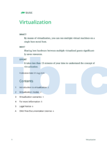 本指南介绍了SUSE Linux Enterprise Server 15 SP5中的虚拟化技术,包括libvirt的统一接口和具体的虚拟化管理程序。内容涵盖虚拟化的好处、模式、I/O虚拟化以及Xen和KVM的基本组件和架构。
