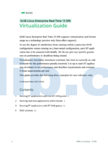 SUSE Linux Enterprise Real Time 15 SP6支持虚拟化和Docker的技术预览,提供最佳努力支持。该文档介绍了在非RT KVM客户机上运行实时应用程序的配置与建议,强调隔离性对实现RT截止期限的重要性。提供了多种示例供用户参考。