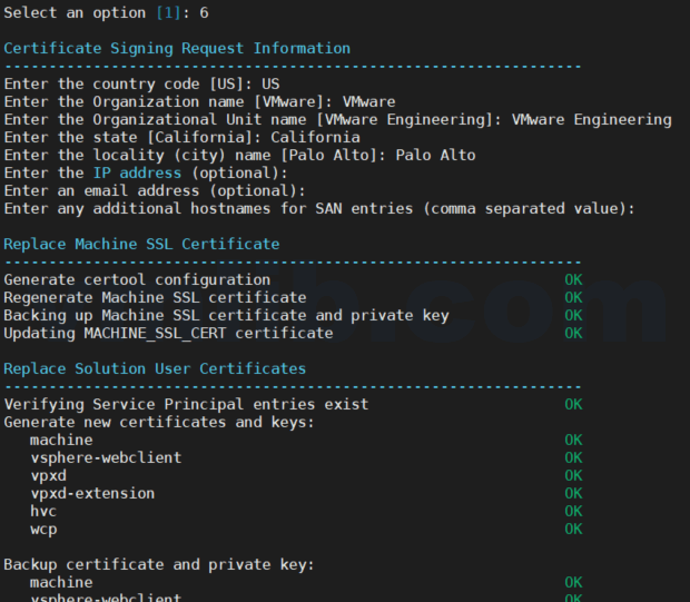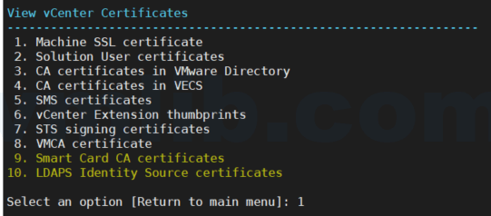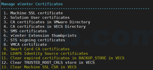 然后用自带的certificate-manager去刷新证书,见https://vmlib.com/vcenter-certificate-expiration-solutions/,处理vCenter证书过期问题很麻烦,办法很繁琐,而且这个自带的证书管理软件certificate-manager只能处理SSL和VCSA根证书,不能处理STS证书。如果是STS证书过期,还要额外下载脚本。
