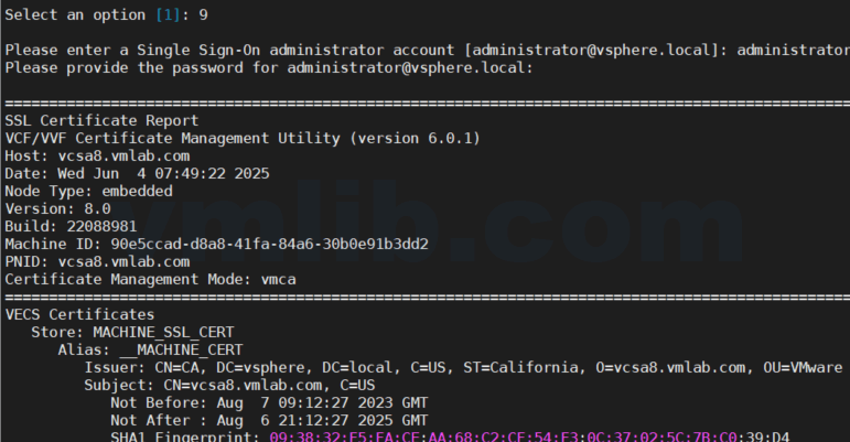 - 该操作将输出所有作为SSL信任锚点使用的唯一证书的信息,涵盖Lookup Service注册和当前 SSO域中所有vCenter节点的Machine SSL证书。