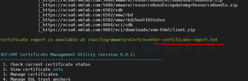 报告将在终端输出,同时也会保存为文件,路径为:/var/log/vmware/vCert