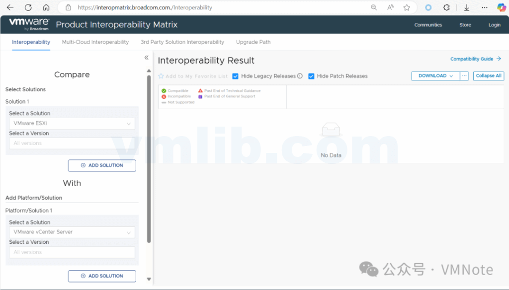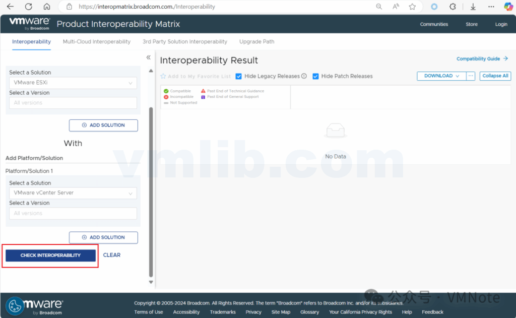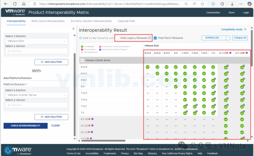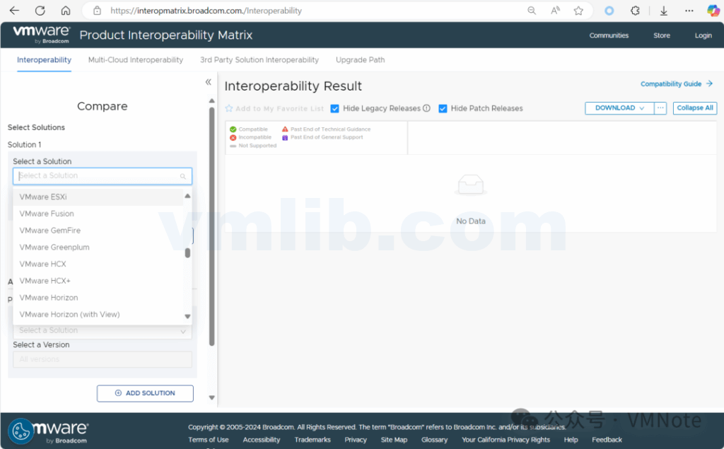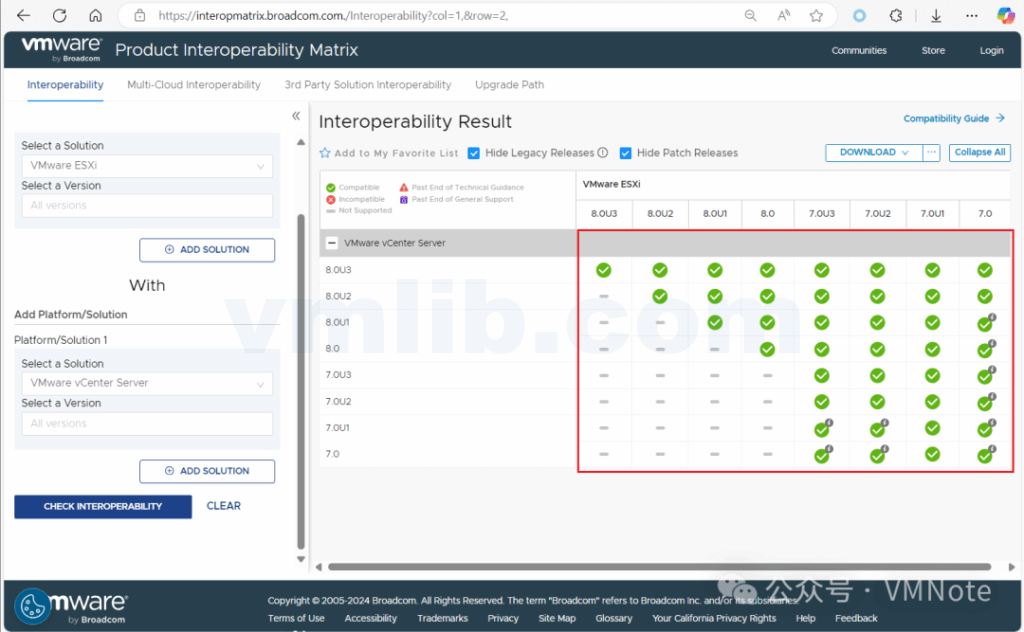 本文以查找VMware vCenter Server与 ESXi之间的兼容性为例,介绍如何在博通网站查询VMware产品之间的兼容性