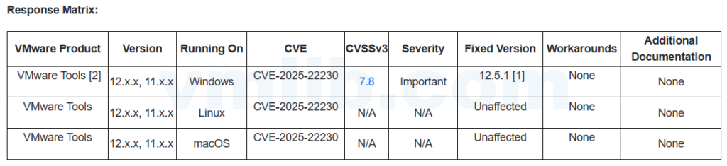 此次漏洞仅影响 VMware Tools for Windows,其他平台的 VMware Tools(如 Linux 和 macOS)不受影响。公告中提到的产品及版本信息如下: