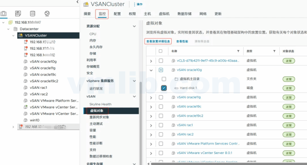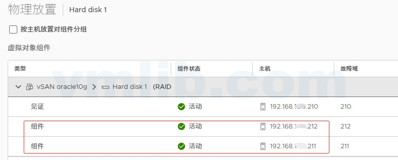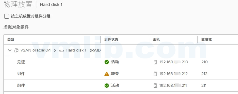 如果vSAN主机关闭时不进行数据迁移,可以通过vSAN集群的“监控”->“vSAN/虚拟对象”->“查看放置详细信息”菜单,检查受影响的虚拟机的虚拟磁盘的组件位置。