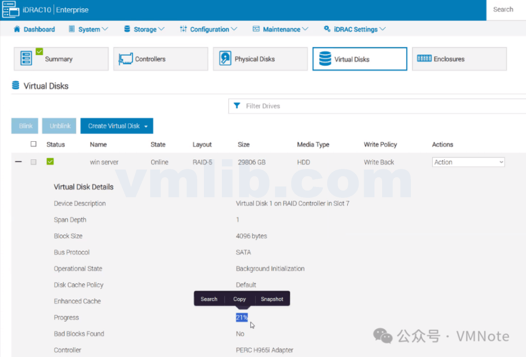 (2)登录iDRAC检查磁盘状态,确认是5块8TB 物理磁盘组建的一组RAID5的虚拟磁盘 ,检查RAID5虚拟磁盘的状态还在初始化中(Initialization),当前进度为21%