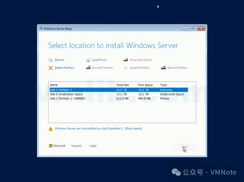 “Windows Server can‘t be installed on disk0 partition 1.“