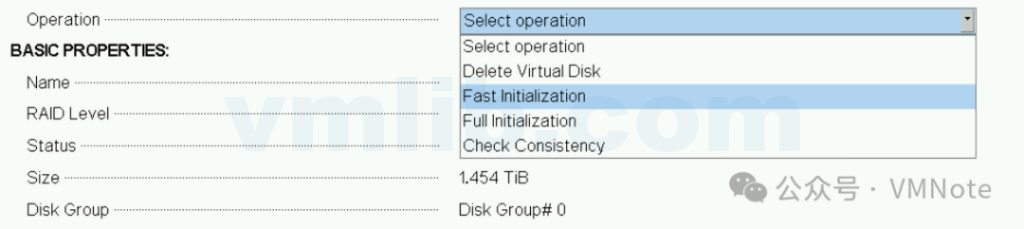 快速初始化:虚拟磁盘的快速初始化将覆盖虚拟磁盘上的第一个和最后一个 8 MB 区段,清除所有引导记录或分区信息。操作仅需 2-3 秒即可完成,但在它之后执行 BGI,这需要更长的时间才能完成。