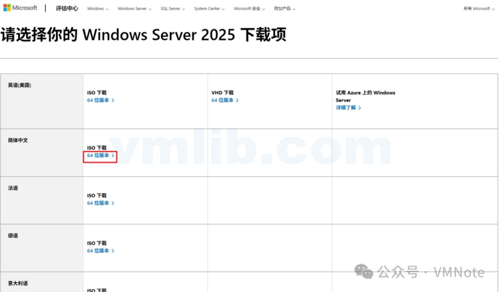第4步,在Window Server 2025 下载页面找到需要下载的版本,然后点击 “64位版本