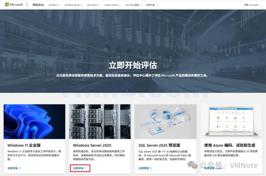 第1步,访问微软评估中心,并在Windows Server 2025 下点击 “立即评估